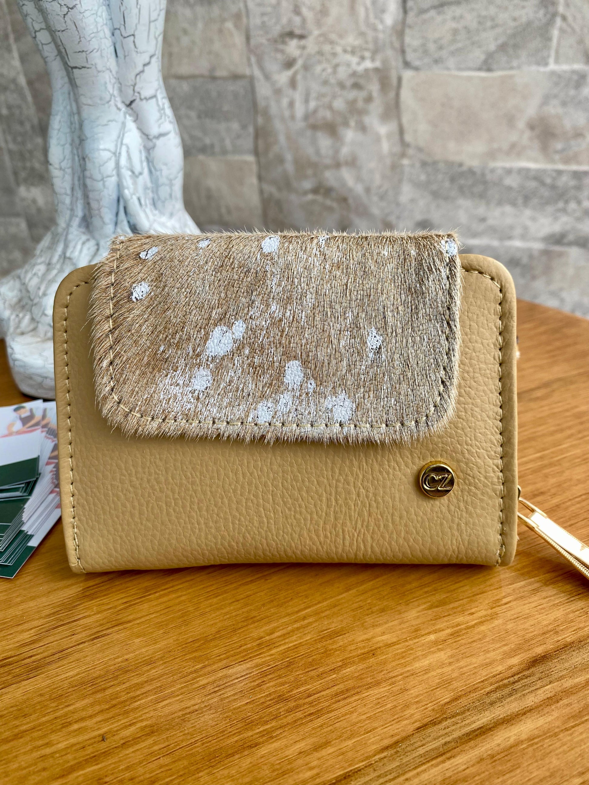 Nuestra cartera en tono beige con textura tipo pony y detalles en blanco es la definición de elegancia discreta.
