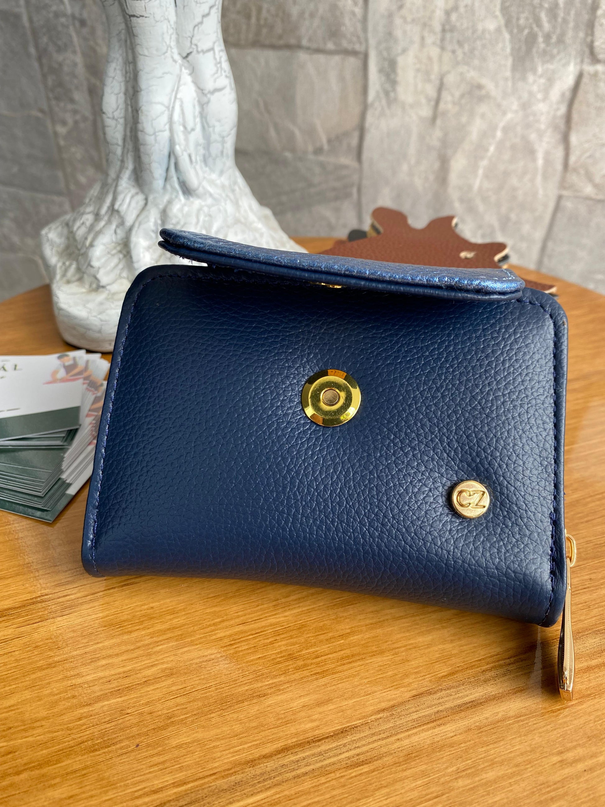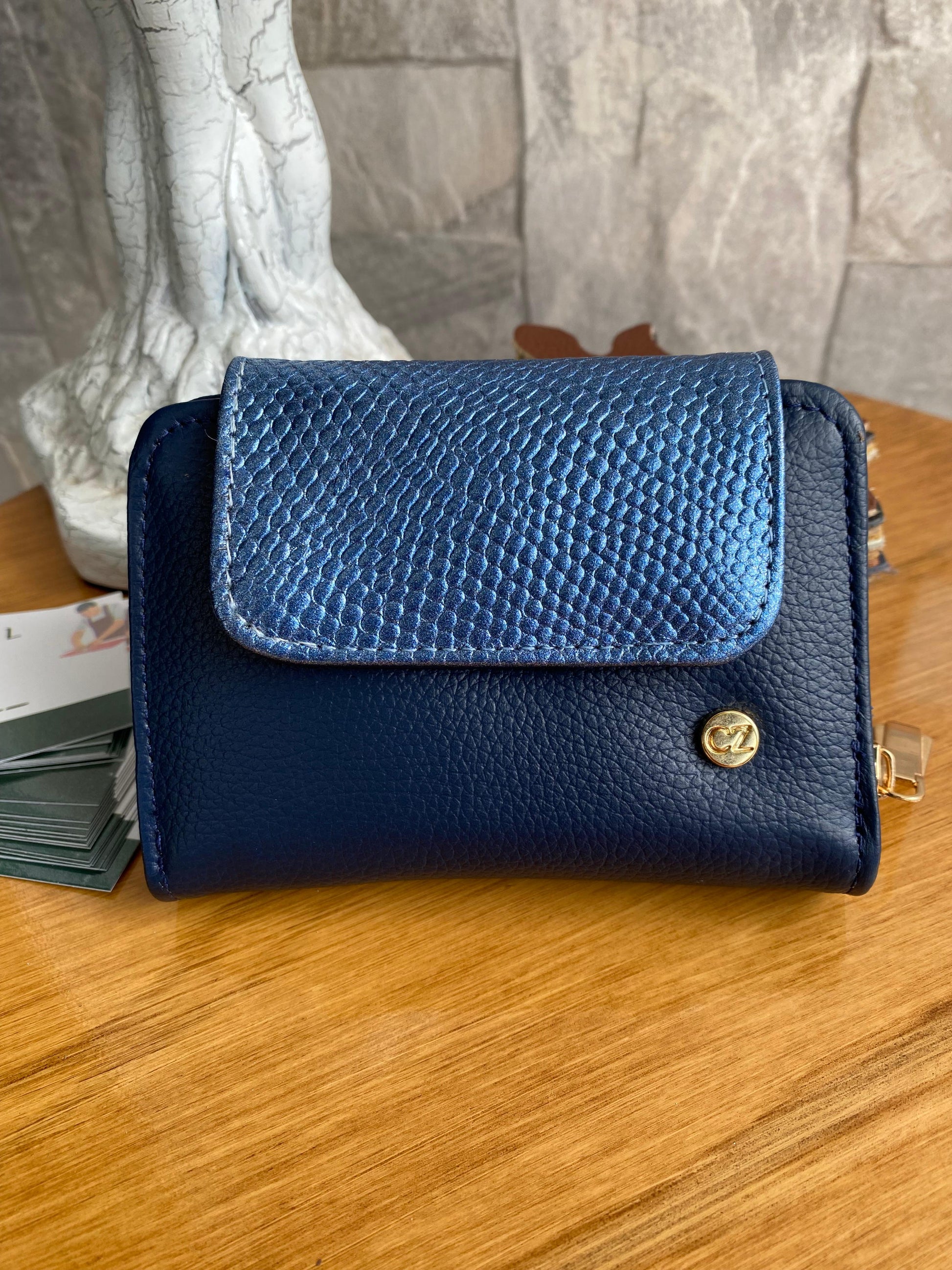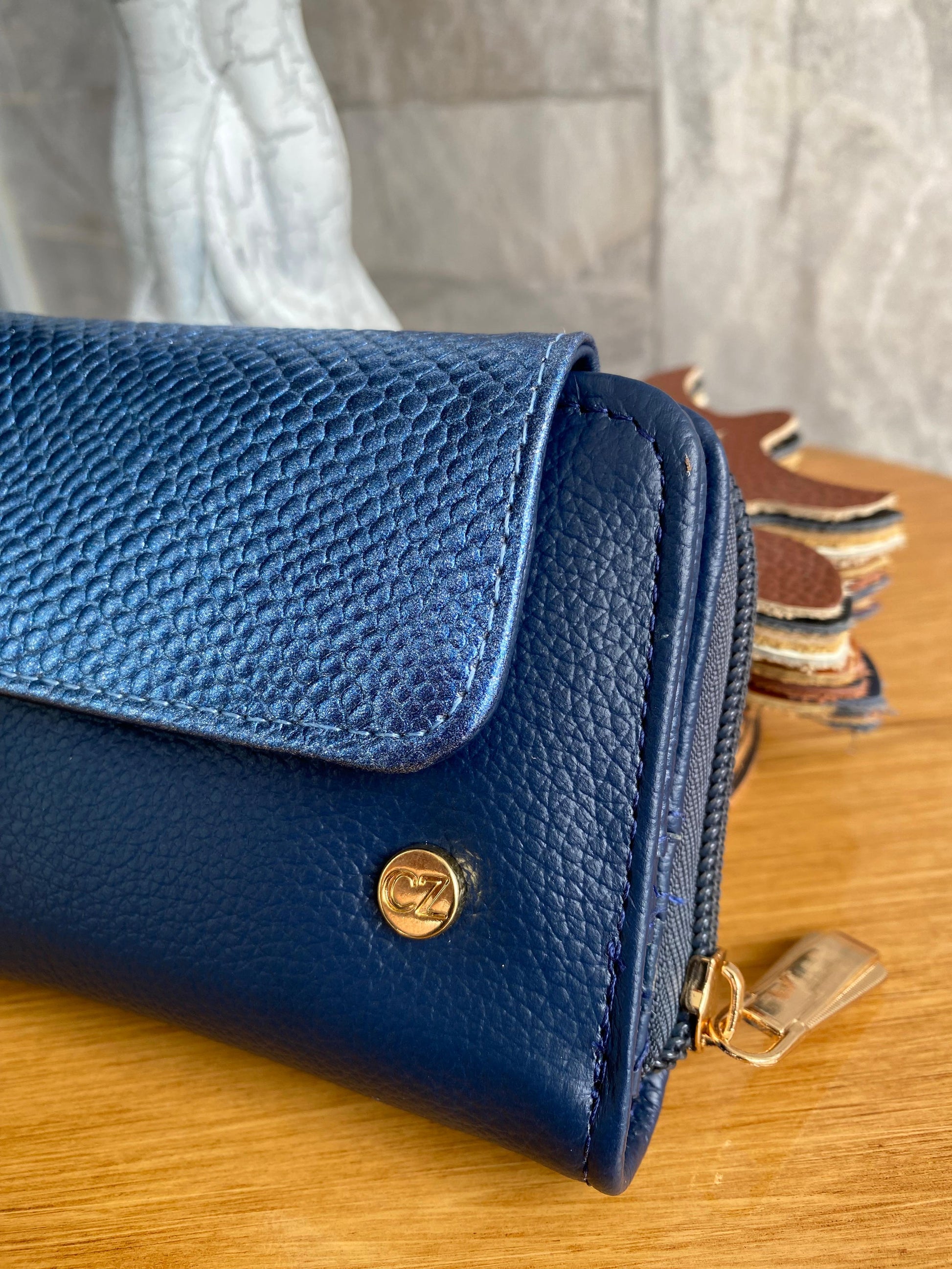 Esta billetera en tono azul marino con tapa texturizada y brillo sutil, combina fuerza y sofisticación en una sola pieza. Un diseño que habla por ti, ideal para destacar en cualquier ocasión.