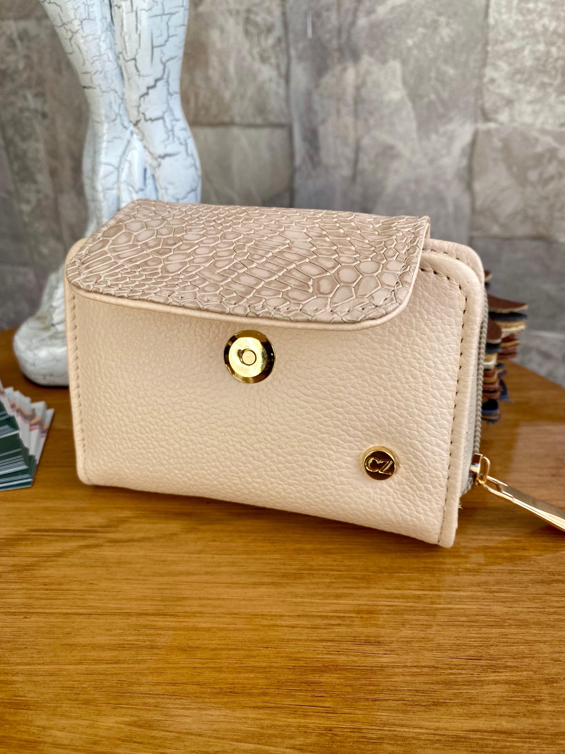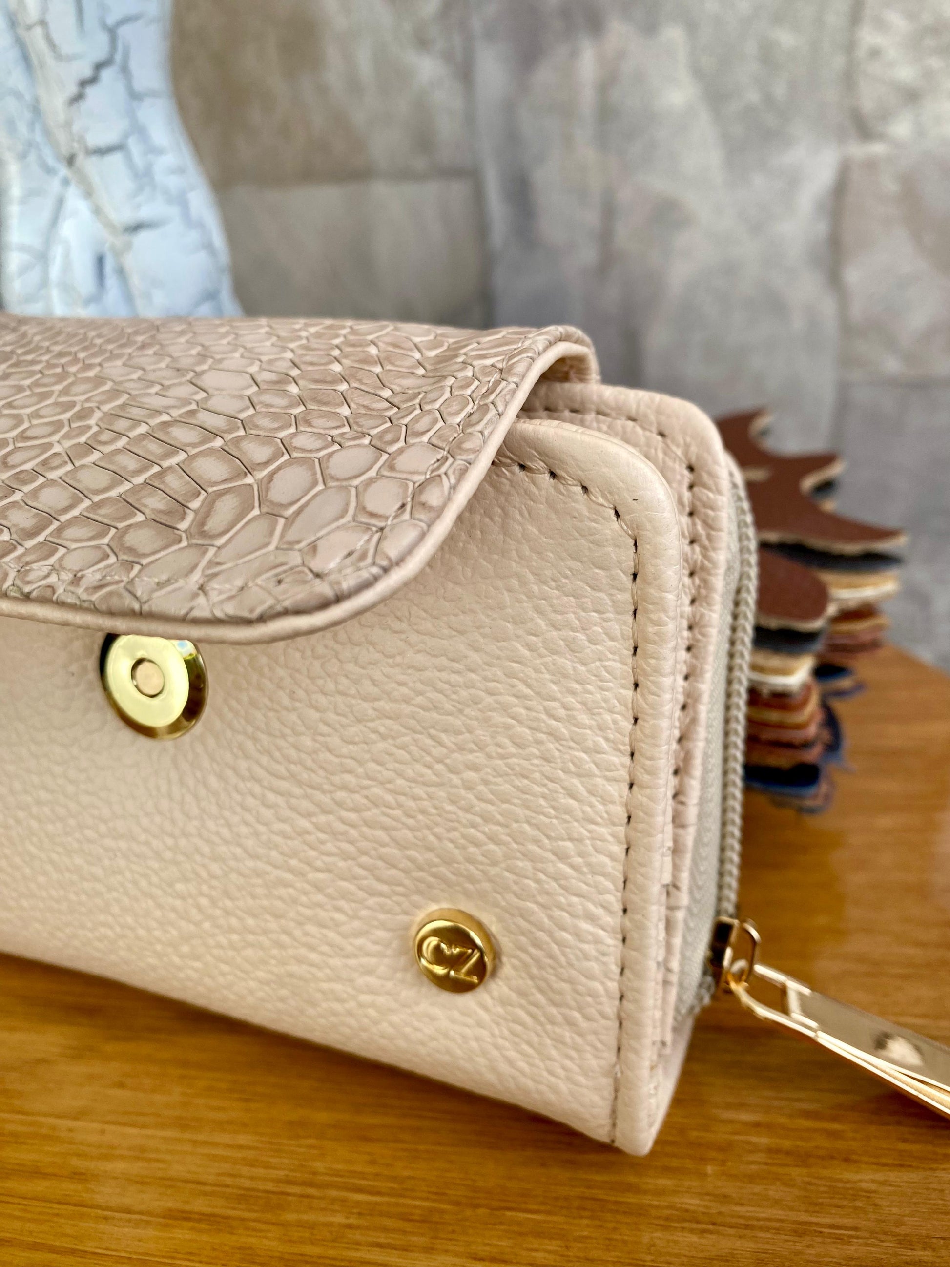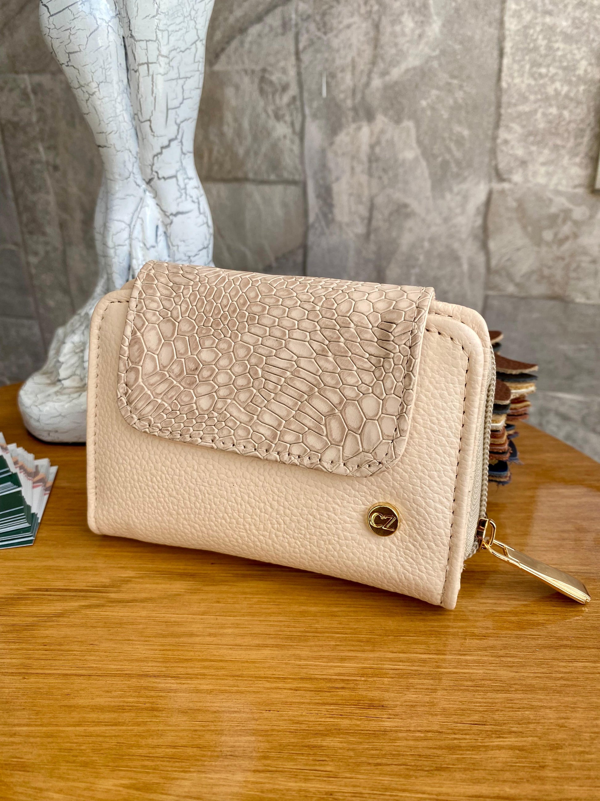 Una billetera que mezcla suavidad en beige tradicional con un toque exótico en textura reptil. Sofisticación que combina con todo.