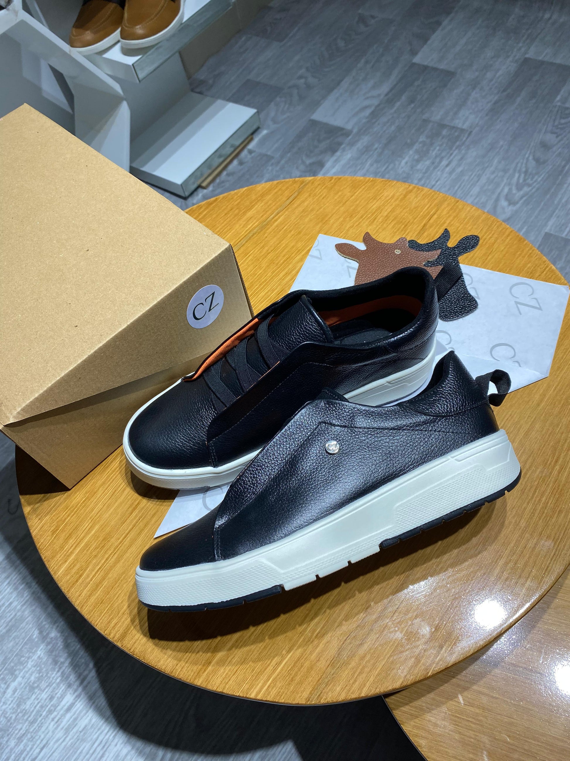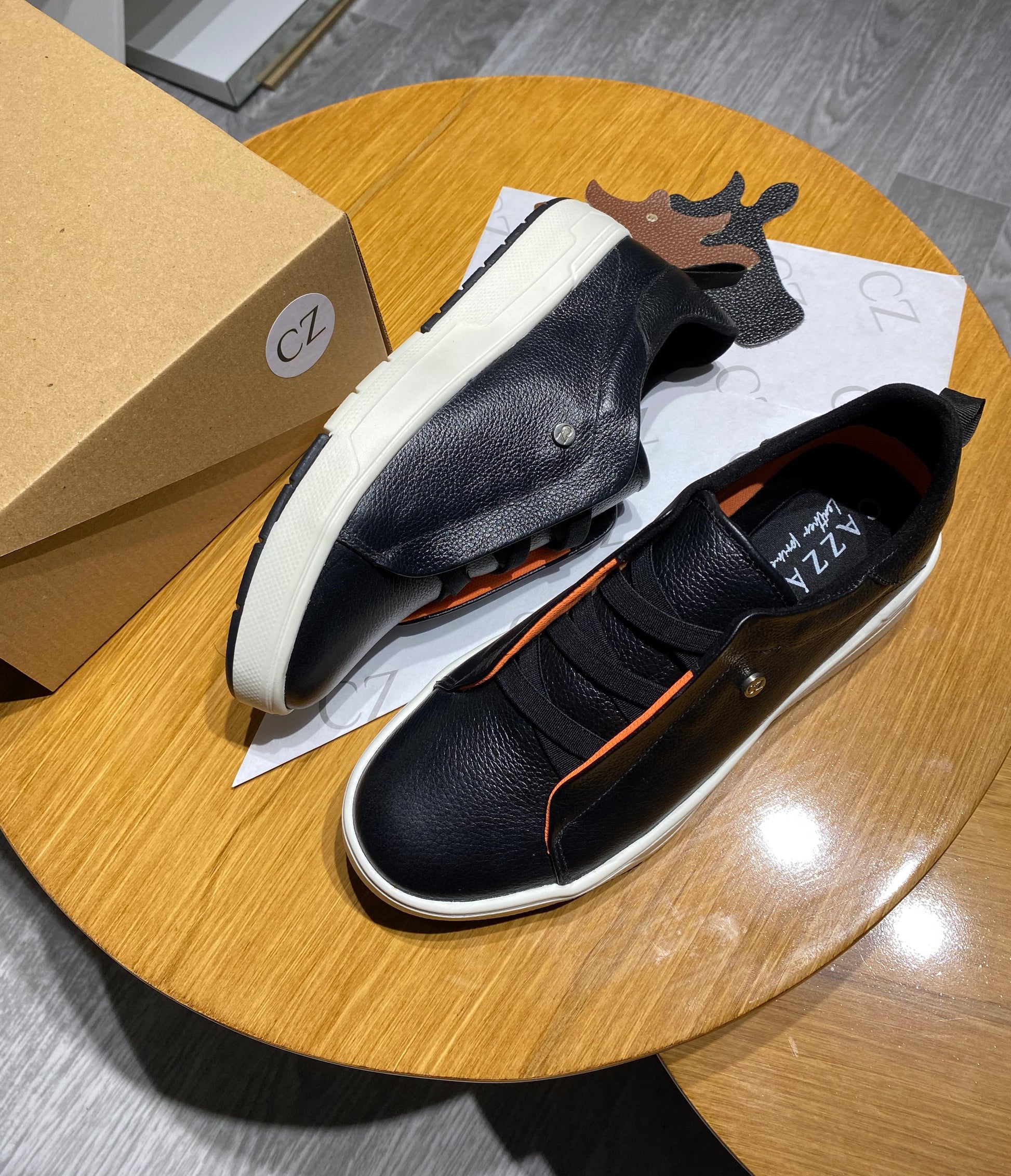 Presentamos el Deportivo Parma CZ, un calzado que combina la elegancia del cuero natural con un diseño deportivo y moderno. Su acabado en negro texturizado aporta un aire sofisticado, mientras que los detalles en naranja vivo y la suela color crema le dan un toque audaz y contemporáneo.