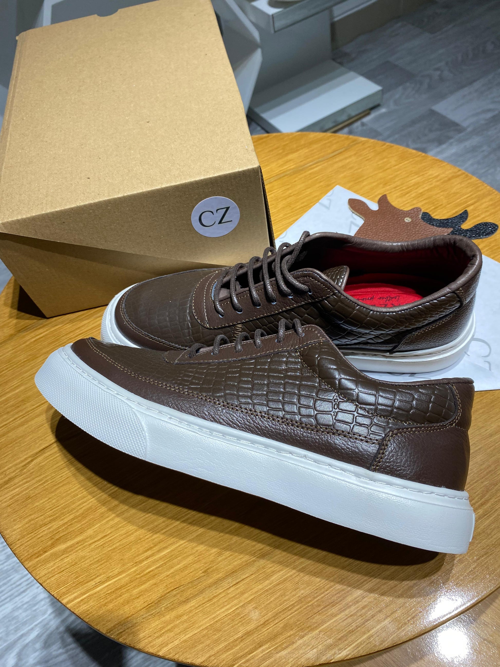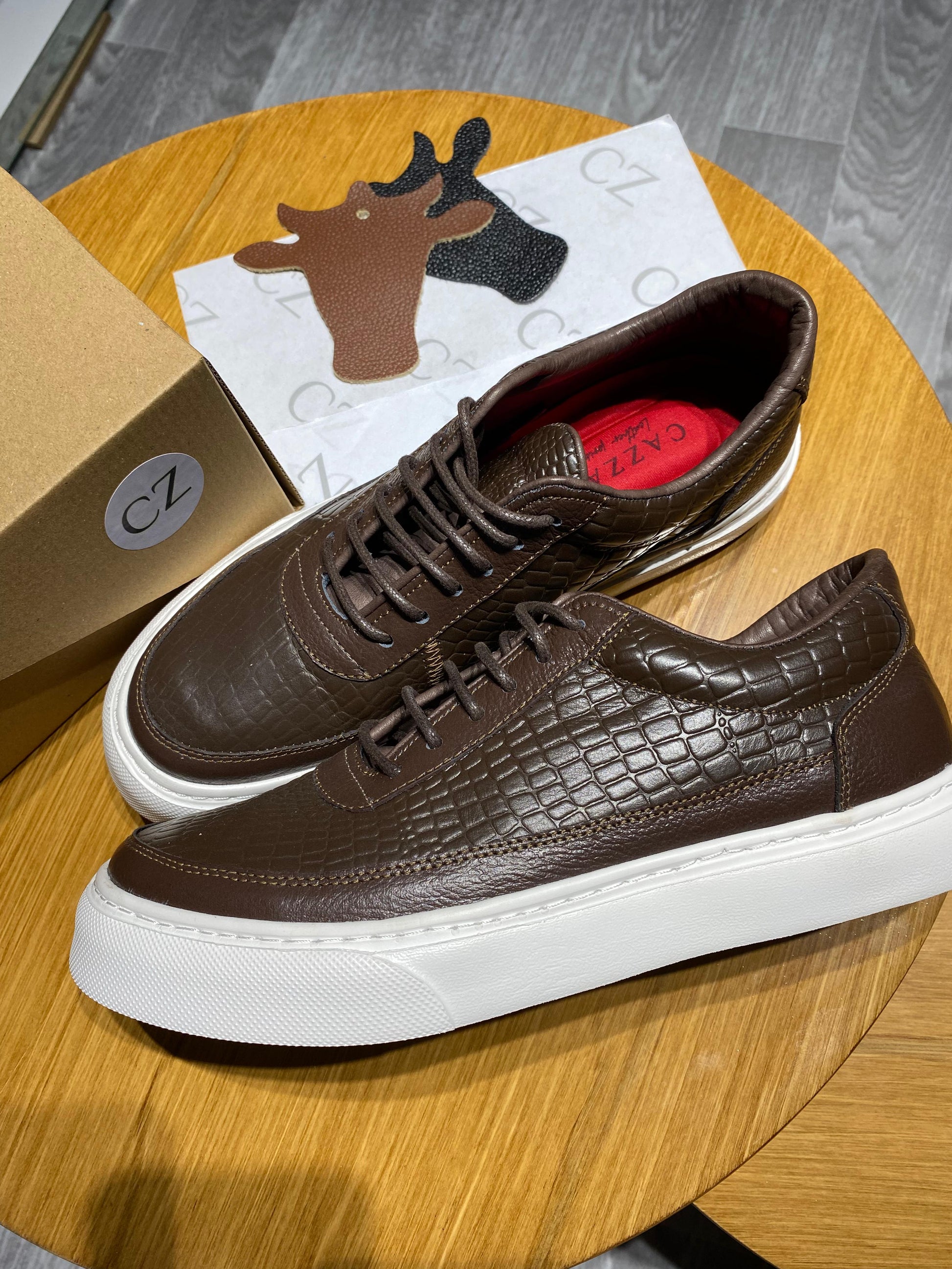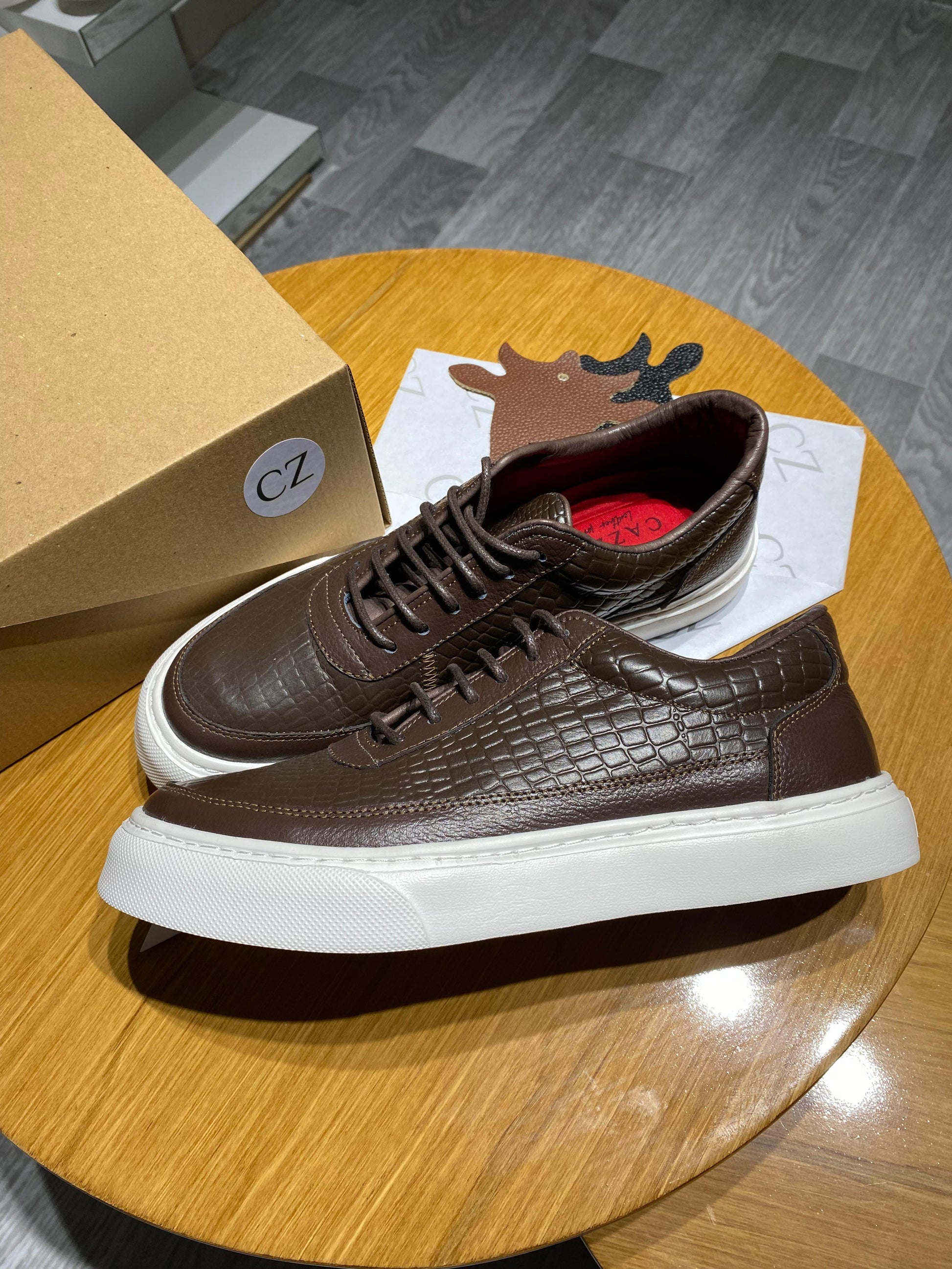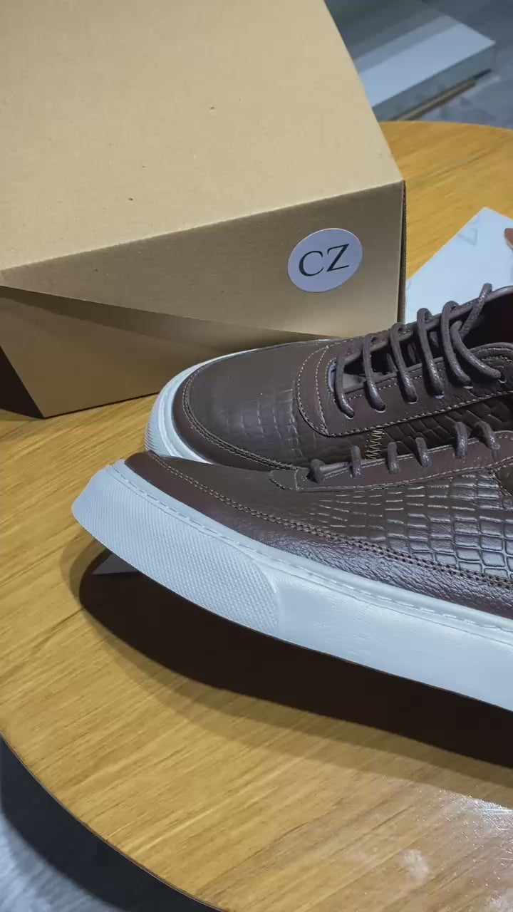 Este sneaker eleva el concepto de calzado urbano con una textura tipo cocodrilo que impone estilo y carácter. Su tono chocolate profundo, combinado con una suela blanca de perfil limpio, crea un contraste moderno, elegante y atrevido.