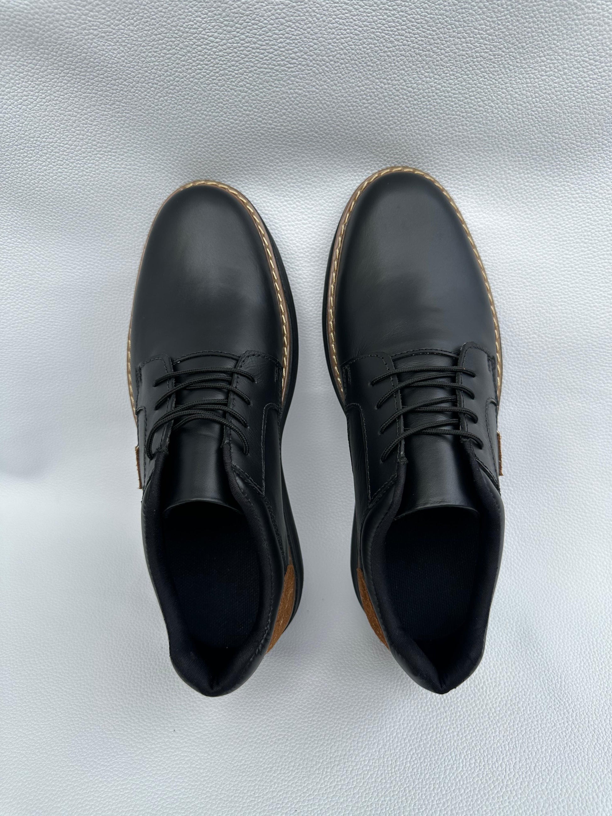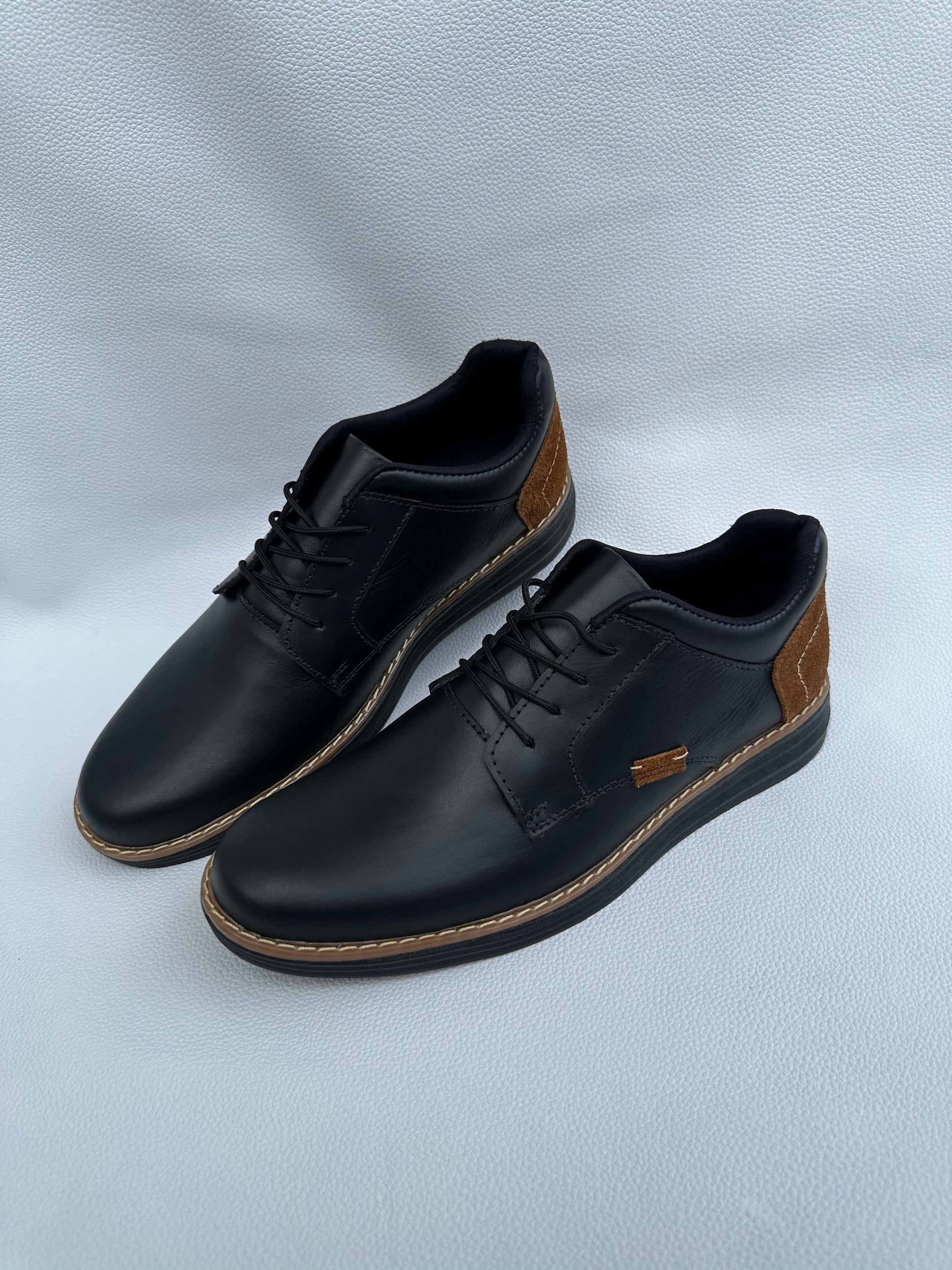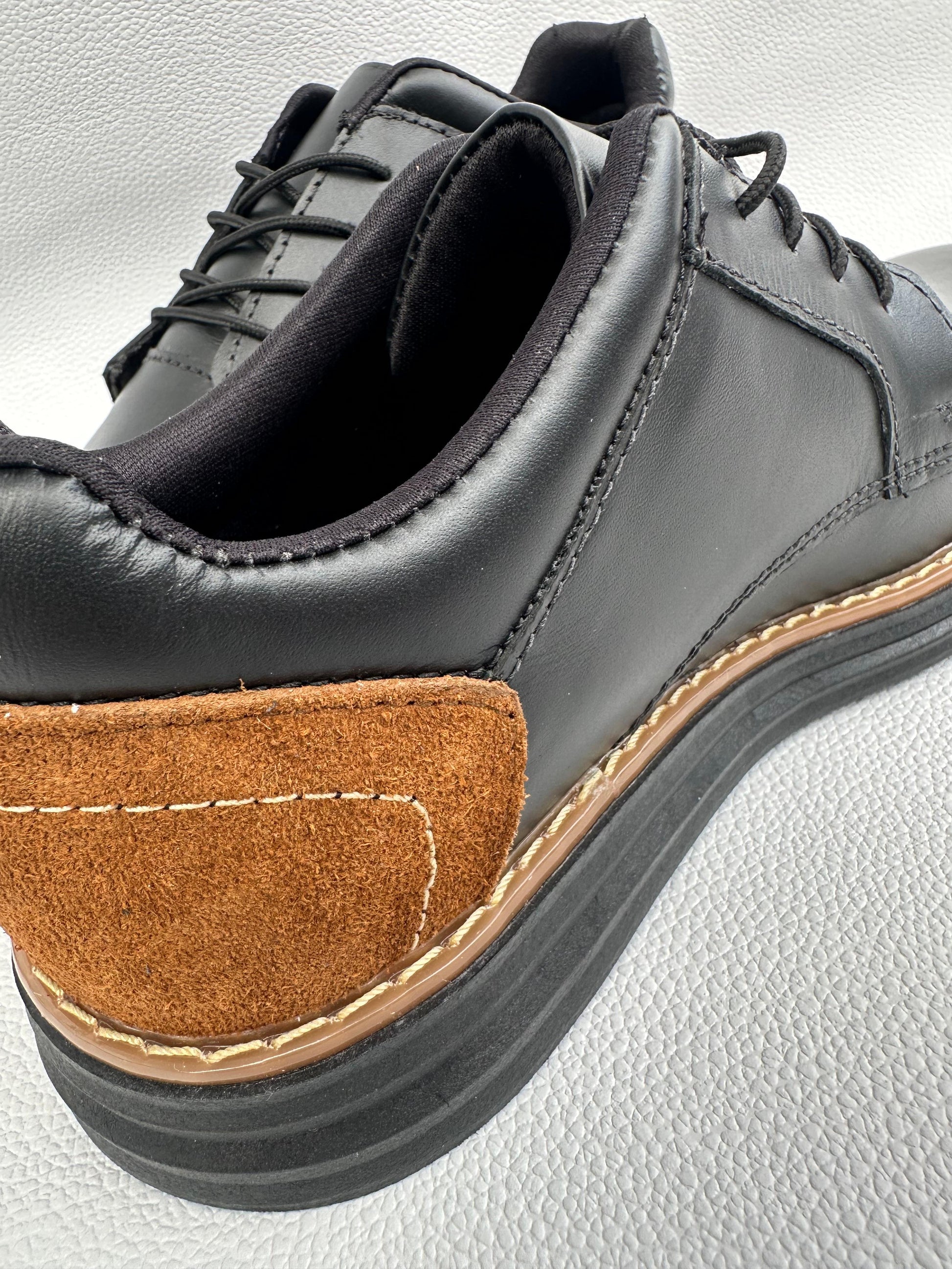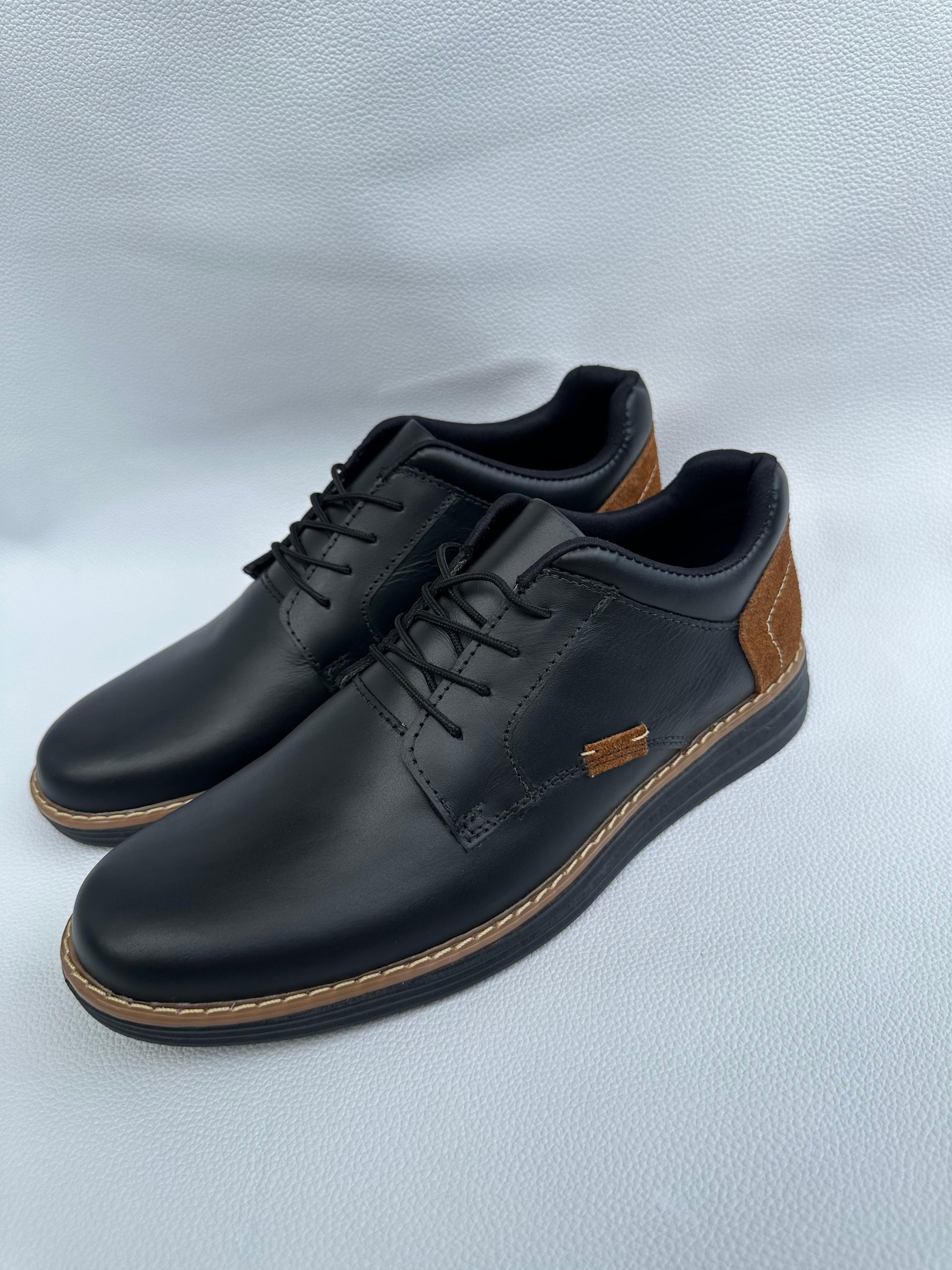 Este modelo de dotación empresarial Cazzal combina la elegancia del cuero negro con detalles en gamuza café, creando un diseño moderno, sobrio y profesional.